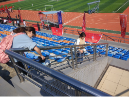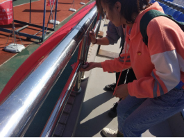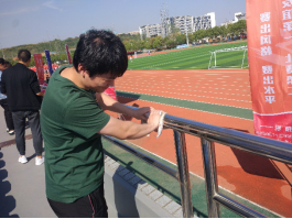 学生党员们分成小组对田径场的观众席进行清洁,擦拭围栏、清洁座椅、打扫垃圾杂物等。各位学生党员们自备抹布,早早到达指定位置集合,听从安排和指挥,任务下达后,认真仔细地开始对负责区域进行了打扫。