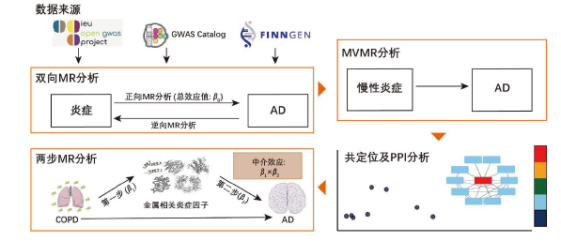 本研究通过整合型MR分析发现并证明了常见呼吸道炎症,慢性阻塞性肺疾病(chronic obstructive pulmonary disease, COPD),是AD特异性高风险因素。接着,本文利用共定位分析发现了内质网氨基酸酶1(ERAP1)是介导COPD向AD转化的关键蛋白,并筛选出5种临床可检测的金属相关炎症标志物(IFN-γ、APOE、IL-1α、IL-6、CRP)。两步MR分析表明,COPD患者中上述标志物水平显著升高,且与AD风险正相关。这些标志物可通过血液检测来评估COPD患者罹患AD的风险,从而为病情进展提供风险预警。