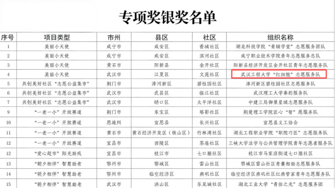 武汉工程大学“红细胞”志愿服务队“社区计划”荣获“美丽小天使”专项赛银奖。