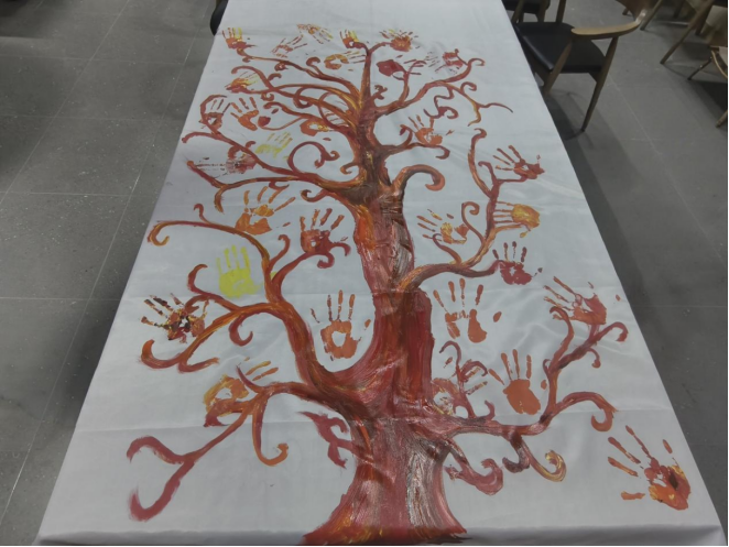 活动现场还设置了互动环节——志愿者们共同绘制“志愿点亮分享墙”。墙面以舒展延伸的树干为基底,来自各志愿团体的志愿者们依次印下专属手掌印,一个个鲜活的手掌错落交织,逐渐汇聚成枝繁叶茂的模样。这一充满仪式感的画面,不仅直观呈现了志愿力量的凝聚与共生,更生动诠释了志愿者们守望相助、同心协作的精神内核,让温暖与担当在指尖传递,为整场交流活动增添了浓厚的共情氛围。