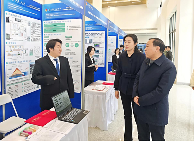 校党委书记汪伟、校长张彦铎、校党委副书记李志旭、副校长马小龙等校领导,各职能部门负责人、校外行业专家及师生代表参观成果展。学院党委书记孔海霞介绍了学院今年在学科竞赛上取得的显著成绩。项目团队成员围绕项目的核心技术原理、创新突破点及落地应用价值展开生动讲解——从“微生物降解水体污染物”的前沿技术,到“智能活性包装膜”的实践方案,每一项都紧扣生态保护与民生改善现实需求,彰显了环生学子以科创回应时代使命与环保重任的担当。