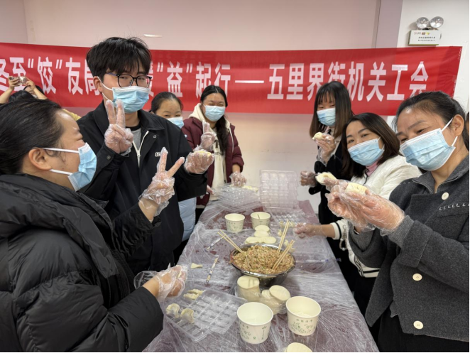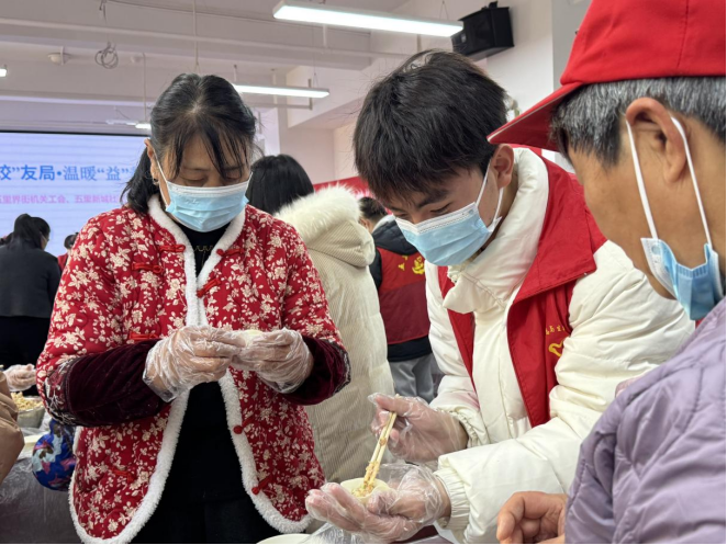 宣讲结束后,热闹的“包饺子之旅”正式开启。活动现场,志愿者们主动走近社区爷爷奶奶,一边虚心请教包饺子的技巧,一边耐心倾听长辈讲述节日往事,现场欢声笑语不断。志愿者们迅速分工协作,擀皮、拌馅、包饺等环节有条不紊地推进,指尖翻飞间,一个个造型饱满、模样整齐的饺子陆续摆放成型。热气腾腾的饺子香气驱散了冬日的严寒,也让志愿者与社区长辈之间的距离悄然拉近。活动尾声,志愿者主动清扫活动场地,整理各类物品,用实际行动践行志愿服务精神。