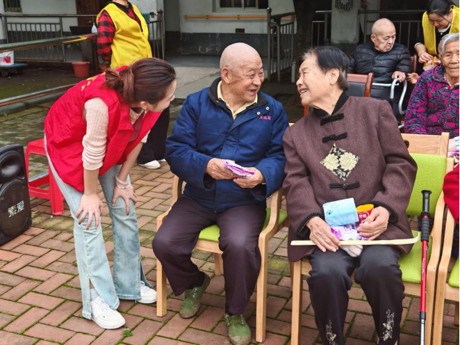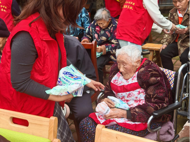 除了精彩的文艺表演,同学们准备了洗衣粉、卫生纸等实用慰问物资。志愿者们轻声叮嘱老人们注意身体、安心休养,用简单的话语传递真挚关怀。老人们接过物资,脸上洋溢着幸福的笑容,眼神中满是欣慰与感动。